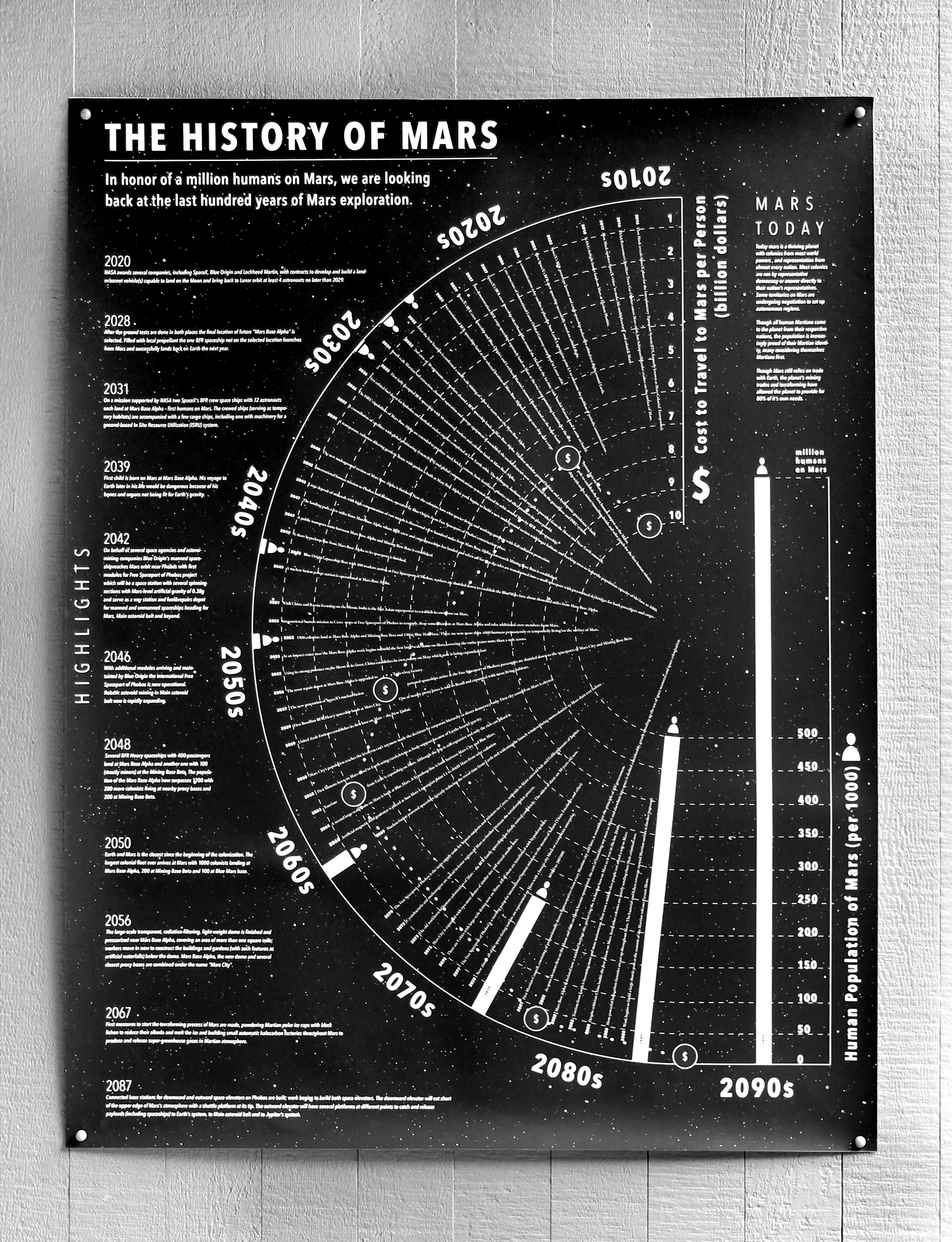 CONCEPT For this project, I made a fictional timeline about humans colonizing Mars in the next 100 years.I used a fictionalized timeline fromspace wiki. I plotted two datapoints: the human population onMars, and the cost per-person tomove to Mars.
